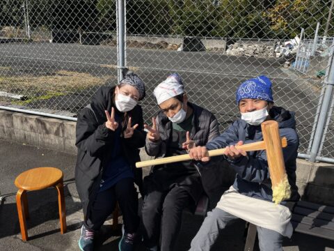 今年も、毎年恒例の餅つきをサポートセンター開駐車場で行いました。